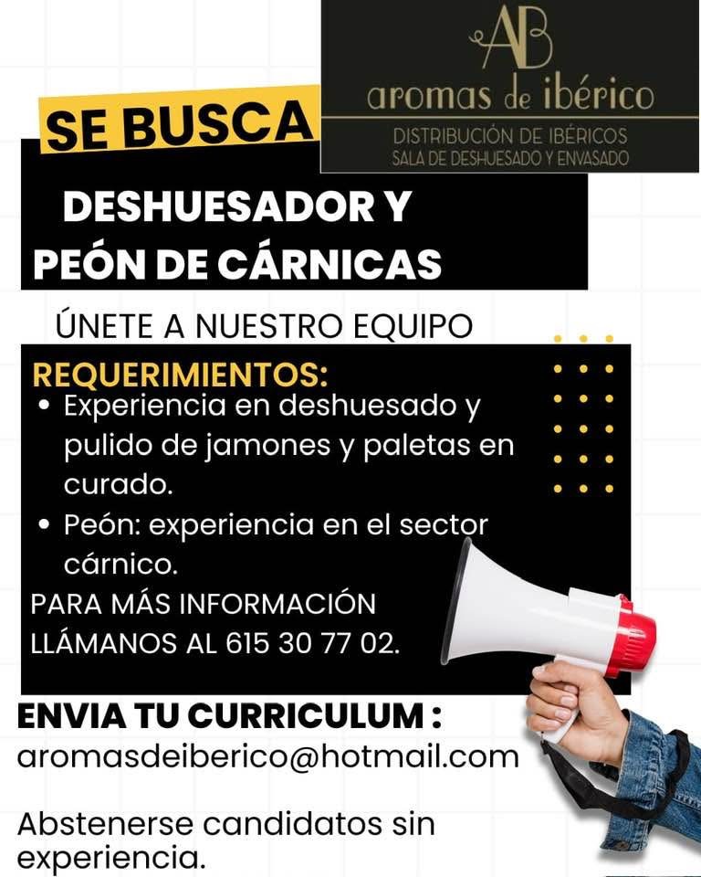 Por un lado, desde Aromas de Ibérico, necesitan incorporar deshuesador y peón de cárnicas para lo que es necesaria experiencia en deshuesado y pulido de jamones y paletas en curado. Si necesitan más información pueden contactar por teléfono en el 615 30 77 02 ó por mail en aromasdeiberico@hotmail.com
