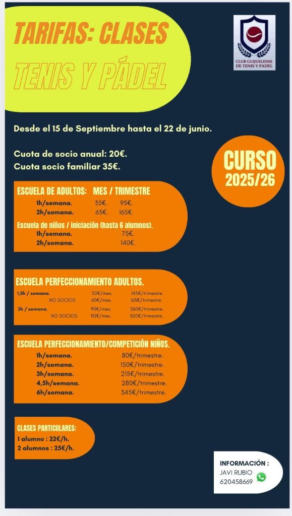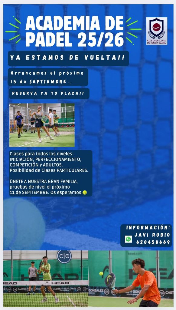 El lunes 15 de septiembre comienza la temporada 25-26 en el pádel con clases para todos los niveles, iniciación, perfeccionamiento, competición y adultos, con la posibilidad de clases particulares. Las inscripciones hay que realizarlas a través del teléfono 620 45 86 69, además mañana jueves existe la posibilidad de hacer una prueba de nivel totalmente gratuita. La temporada se desarrollará hasta el próximo 22 de junio. Las tarifas se pueden consultar a través de las redes sociales del club guijuelense de tenis y pádel.