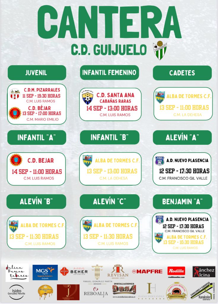 El Juvenil tiene doble compromiso, esta tarde, a las siete y media en el Municipal Luis Ramos se mide al Pizarrales y el sábado a las cinco, en el Mario Emilio visita al Béjar. El Cadete y el Infantil B visitan el sábado Alba de Tormes, a las once es el turno del Cadete y a la una del Infantil B. Por su parte, el Infantil A se mide el domingo, a las once, en casa, al Béjar Industrial. En alevines, el equipo A viaja mañana viernes, a las cinco y media a Plasencia para enfrentarse al Nuevo Plasencia mientras que el Alevín B y C se miden el sábado a las once y media, en el Luis Ramos a Alba de Tormes. Por último, doble cita para el Benjamín A, el viernes a las cinco y media se enfrentan al Nuevo Plasencia y el sábado a las diez y media, en casa al Alba de Tormes.