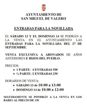 Por último, San Miguel tanto el sábado como el domingo se pondrán a la venta las entradas para la novillada del día 27. La venta será exclusiva para los abonados de años anteriores y para los hijos del pueblo. El sábado se podrán adquirir de 10 a 13h y el domingo, de 10 a 12h en el consistorio del municipio.