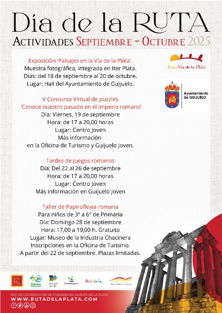 Como cada 18 de septiembre, Guijuelo se suma a la celebración del Día de la Ruta de la Plata con diferentes propuestas con el objetivo de conmemorar el nacimiento de Marco Ulpio Trajano, emperador romano que contribuyó a la construcción de la Vía de la Plata. Para celebrarlo, el Ayuntamiento de Guijuelo ha organizado un programa con diferentes propuestas tal y como ha indicado la concejala de Turismo, Sandra Méndez en la inauguración de la muestra ‘Paisajes en la Vía de la Plata’ que estará disponible en el hall del Consistorio hasta el 20 de octubre. A lo largo de esta semana el Centro Joven conmemora este día con las tardes de juegos romanos y este viernes día 19, se celebrará el V concurso virtual de puzzles ‘Conoce nuestro pasado en el Imperio Romano’.