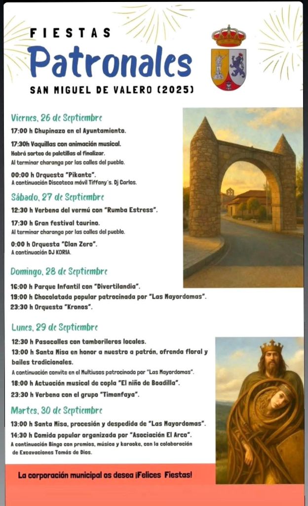 Las Fiestas patronales de San Miguel de Valero se celebrarán a partir de este viernes día 26 y a lo largo de cinco jornadas festivas honrarán a San Miguel con muchas propuestas.