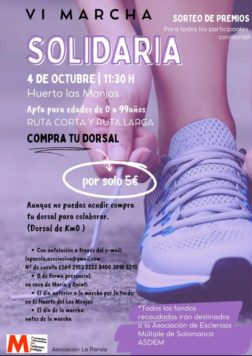Este sábado y como inicio a los festejos se llevará a cabo la VI Marcha benéfica destinada a todas las edades cuya recaudación se destinará a Asdem, la asociación salmantina de esclerosis múltiple. La salida tendrá lugar desde el Huerto de las Monjas y los dorsales están disponibles a un precio de 5€ a través del mail, laparola.asociacion@gmail.com; de forma presencial en casa de María y Quinti, el día anterior a la marcha en el Huerto de las Mojas y también se podrá adquirir el mismo día del evento.