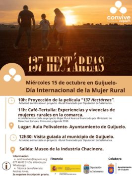 El acto está organizado por la fundación Cepaim, financiado por la Diputación de Salamanca y colabora el Ayuntamiento de Guijuelo. El programa comenzará a las 10 de la mañana con la proyección del mediometraje ‘137 hectáreas’, continuará con un café-tertulia en el que participarán mujeres rurales de la comarca y se llevará a cabo en la sala Polivalente del consistorio guijuelense. El programa se completará con una visita guiada por el municipio.