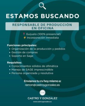 Relacionado con el sector porcino, desde Castro y González buscan incorporar a un responsable de producción en oficina que se encarge de gestionar compras, dar soporte al software Sage y organizar la producción y pedidos. El candidato trabajará de forma presencial en Guijuelo, pero eso sí, debe contar con varios requisitos como tener conocimientos en ofimática, manejar el Sage y ser una persona organizada y resolutiva.