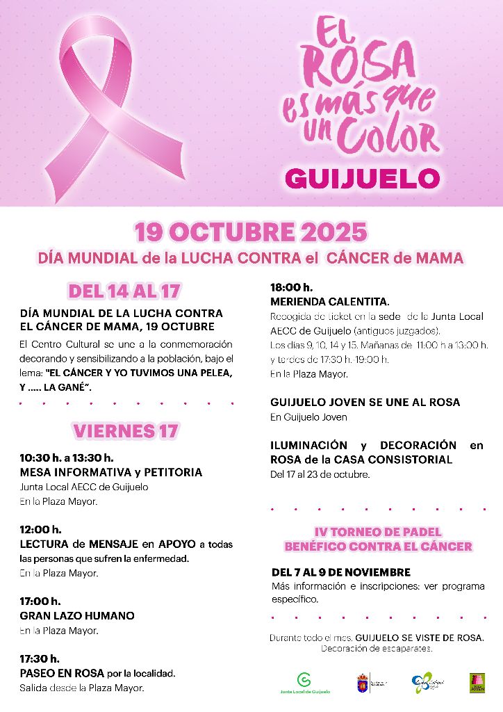 Por su parte, el día 17 de octubre será el día en el que se concentrarán un mayor número de citas. Por la mañana, en la plaza Mayor, la junta local de la AECC colocará una mesa informativa y petitoria. A las 12, también en la plaza Mayor, se procederá a la lectura de un mensaje de apoyo a todas las personas que sufren la enfermedad. A las cinco de la tarde será el momento formar un ‘Gran lazo humano’, en la plaza Mayor, a las cinco y media tendrá lugar el ‘Paseo en rosa’ por la localidad, a las seis de la tarde, por un lado, comenzarán las citas para los jóvenes en Guijuelo Joven y, por otro lado, se celebrará la ‘Merienda calentita’, Por último, hay que destacar que, por la noche, desde el 17 y hasta el 23 de octubre, la fachada del Ayuntamiento se vestirá de rosa.