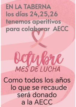 Por otro lado, y como cada año, desde La Taberna se suman a la conmemoración del 19 de octubre para luchar contra el cáncer de mama. Por eso, durante todo este fin de semana habrá pincho solidario en el establecimiento y todo lo que se recaude irá destinado a la Junta Local de la AECC.