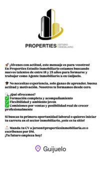 Más oportunidades de empleo las encontramos en Properties Estudio Inmobiliario donde buscan jóvenes con actitud, entre 18 y 25 años que tengan interés en formarse y trabajar como agentes inmobiliarios en Guijuelo. No se necesita experiencia, sólo ganas de aprender, trabajar y que tengan actitud y motivación. La empresa ofrece formación completa, acompañamiento, flexibilidad y un ambiente joven, además de ofrecer comisiones por venta y posibilidad real de crecer profesionalmente.