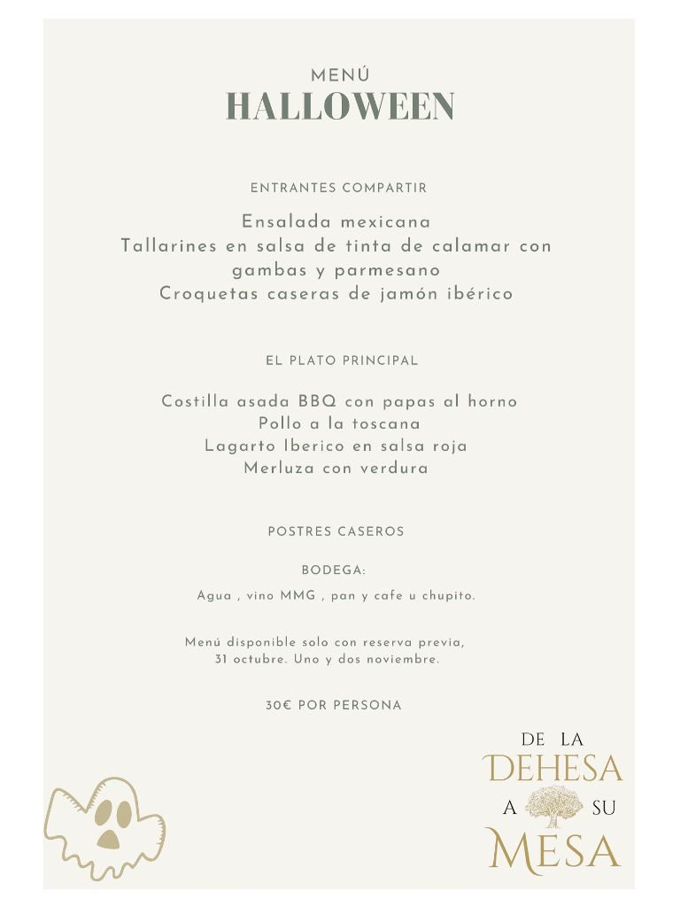 El restaurante de la Dehesa a su mesa ofrece menús diferentes para celebrar esta fecha: uno para los adultos con entrantes para compartir, plato principal a elegir entre costilla BBQ, pollo toscana, lagarto ibérico y merluza con verduras y pensando para los niños, un menú infantil de miedo con un plato terrorífico a elegir, postre fantasmagórico, además de una bebida mágica. Si necesitan más información pueden llamar al restaurante.