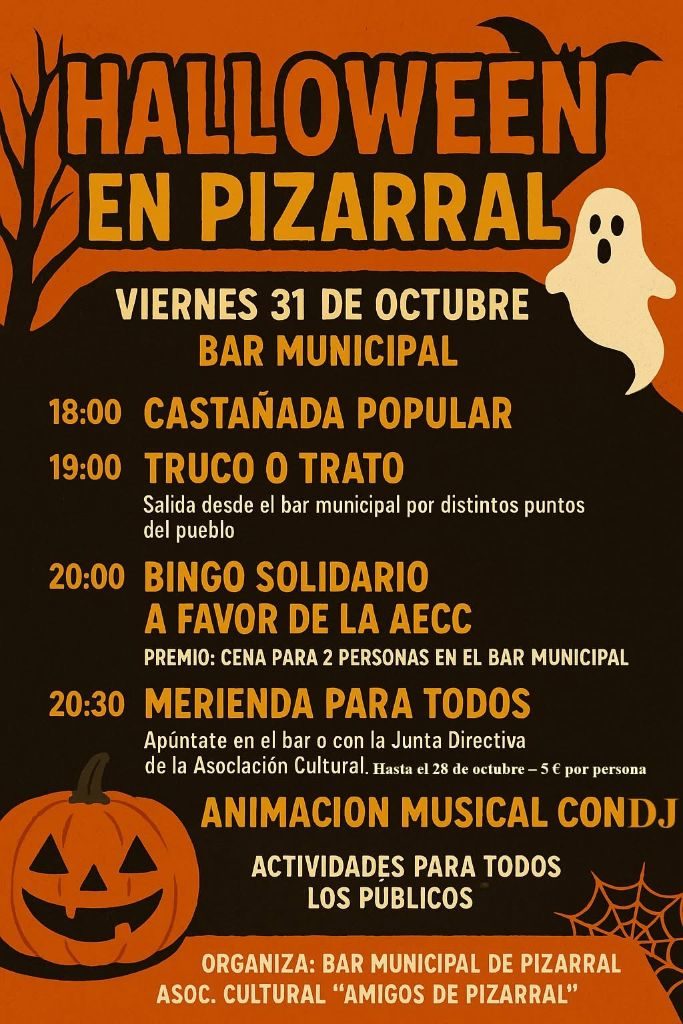 El menú de Halloween que han preparado en Pizarral para este viernes constará de castañada popular, la propuesta Truco o Trato por diferentes zonas del pueblo, además de bingo solidario a favor de la AECC con premio de una cena para dos personas, la merienda de Halloween para todos y animación musical.