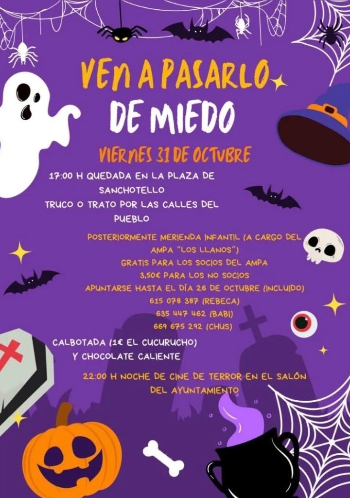 Más propuestas para hoy las encontramos en Sanchotello donde quedarán a partir de las cinco en la plaza, recorrerán las calles del municipio con la actividad Truco o Trato y el AMPA Los Llanos ofrecerá una merienda infantil. Por último, por la noche, sesión de cine de terror en el salón del ayuntamiento.