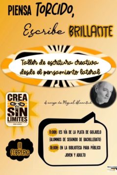 Alcantud se desplazará primero hasta el Instituto Vía de la Plata de Guijuelo donde desde las once impartirá un taller de escritura creativa a los jóvenes. Después continuará su recorrido hasta los estudios de Radio Guijuelo donde presentará, en directo, a partir de las 12:45h su última publicación ‘Crea sin límites. Pensamiento lateral para transformar tu escritura’.